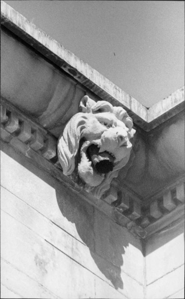 How amazing is that? When is the last time you saw a lion’s mouth used as a drain spout? This detail brought me so much joy and is definitely my favorite exterior feature. The black and white photo does not do it full justice. Make sure you take a look out the windows as you tour the Turnblad Mansion.